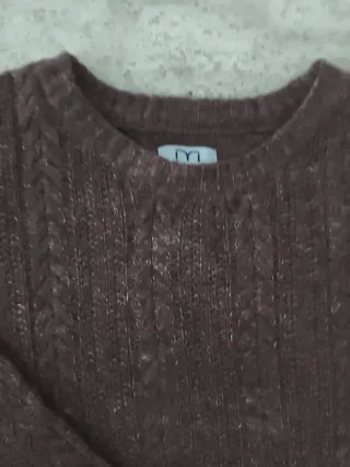 Jersey de punto en color marrón. Presenta un diseño tejido con textura. - Cuello redondo. - Manga larga. - Tejido con hilo brillante.