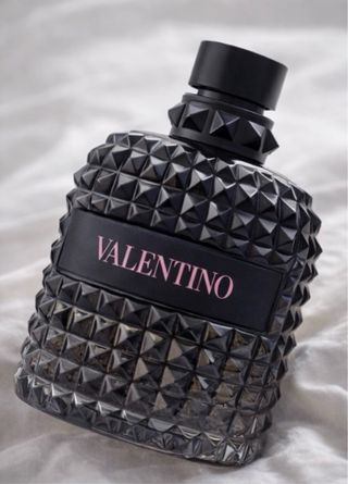 Colonia Valentino Uomo Born in Roma. - Diseño de botella con tachuelas. - Etiqueta negra con detalles en rosa. -🌿 Familia olfativa Amaderada – Especiada – Aromática Es una fragancia equilibrada: fresca al inicio, especiada en el corazón y cálida al final.