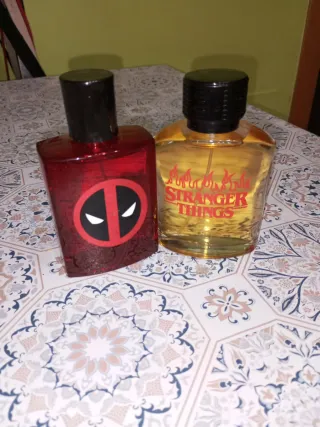 Lote de dos colonias con diseños inspirados en personajes. -Para chicos‼️ - Colonia con tapa negra y frasco rojo con diseño de Deadpool. - Colonia con tapa negra y frasco transparente con diseño de Stranger Things.