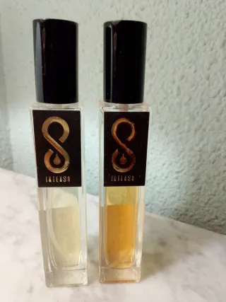 Dos tarros de colonia de la marca Intenso. - Botellas de cristal transparente. - Tapas negras. - Detalles dorados en la etiqueta.