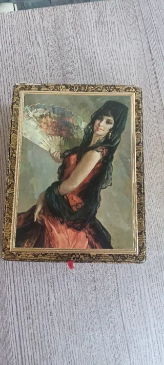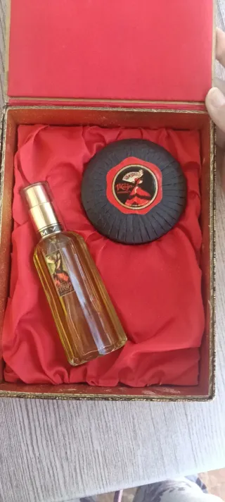 Estuche de la marca Myrurgia que incluye colonia y jabón. - Diseño con imagen de mujer con abanico. - Detalles en encaje negro y dorado. Ideal para coleccionistas