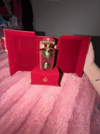 Elegante colonia de la marca Sakeena. - Botella de terciopelo rojo con detalles dorados. - Diseño distintivo en la tapa y la base. - Etiqueta con el nombre de la marca en dorado.