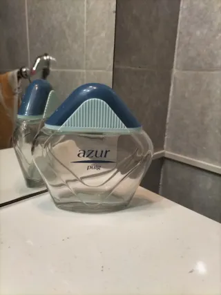 Botella vacía de la fragancia Azur de Puig. - Diseño de cristal transparente. - Tapón azul con detalles acanalados.