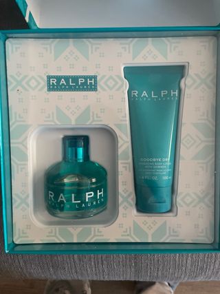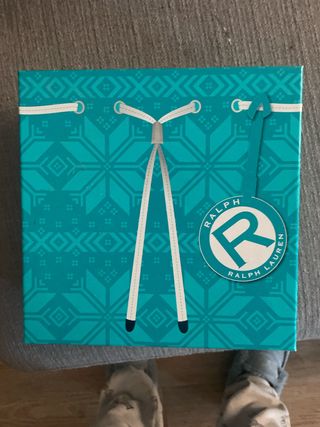 Presentación de colonia Ralph Lauren con un diseño llamativo. - Caja con estampado geométrico en tonos teal y blanco. - Detalle de cordones y etiqueta circular con logo.