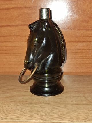 Antiguo frasco de colonia de AVON con forma de caballo. - Diseño detallado de cabeza de caballo. - Tapa metálica. - Asa de metal en la brida.