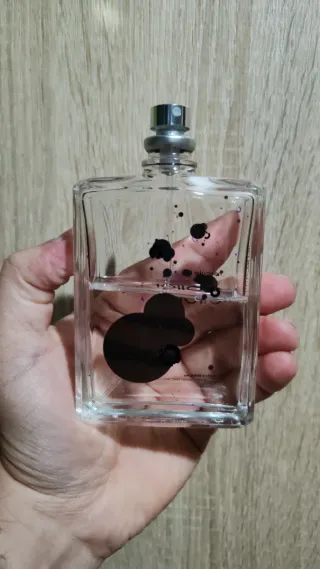 Perfume Escentric Molecules Molécula 01. - Botella de cristal transparente. - Diseño con salpicaduras y círculos en tonos grises y morados.