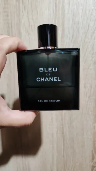 Este es el perfume Bleu de Chanel Eau de Parfum. - Fragancia masculina. - Botella de vidrio azul oscuro. - Tapa negra.