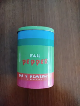 Caja de colonia con un diseño vibrante y colorido. Presenta un estampado de rayas horizontales en tonos verdes, azules y rosas. - Diseño de rayas multicolor. - Texto EAU PEPPER en la parte frontal. - Texto SAL Y PIMIENTA fragrances en la parte inferior.
