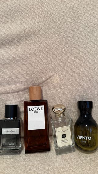 Conjunto de tres frascos vacíos de colonia, perfectos para coleccionistas. - La vie est belle de Lancôme de 100 ml. Un frasco de diseño cuadrado y transparente con detalles plateados. - DKN. Be Delicious, de 100 ml. Un frasco esférico y plateado. - Diésel. Fuel for life, de 75 ml. Un frasco con un diseño único forrado con tejido de color beige. Los 3 frascos por 6 €, pero si se compran por separado a 3 € cada uno.