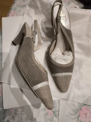 Elegantes zapatos de tacón destalonados de la marca Valentino. - Color beige con detalles en piel. - Diseño con perforaciones y tira ajustable al tobillo. - Punta fina.