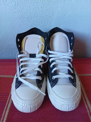 Zapatillas Converse de plataforma con un diseño moderno y llamativo. Son dos pares unas y blancas y negras las blancas no se han usado las negras una vez se venden juntas o por separadas 30 cada una - Color negro y detalles en beige. - Cordones blancos. - Suela gruesa y ondulada.