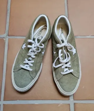 Zapatillas Converse One Star de ante en color verde oliva. Ideales para un look casual. - Suela de goma. - Diseño clásico con estrella. - Poquísimo uso.