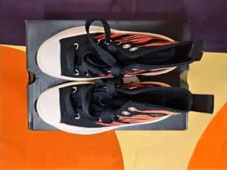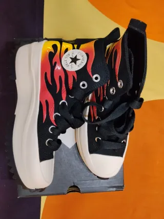 Zapatillas Converse All Star de caña alta, con un llamativo diseño de llamas en tonos rojos y amarillos sobre fondo negro. La suela es blanca y gruesa, aportando un estilo moderno. Talla 35 y medio. Nuevas con etiquetas. Modelo Run Star. Unisex.
