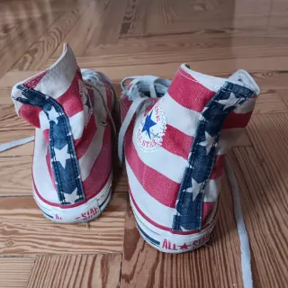 Zapatillas altas Converse All Stars con diseño de la bandera de Estados Unidos. - Estampado de estrellas y barras. - Cordones grises. - Suela de goma blanca.