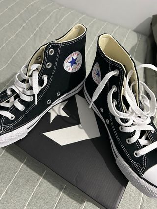 Zapatillas Converse de caña alta en color negro. Un clásico que nunca pasa de moda. - Modelo: Chuck Taylor All Star. - Cierre con cordones blancos. - Suela de goma blanca. - Logo circular de Converse en el lateral. -Sin utilizar, como se puede observar en las suelas que estan impecables. Ha sido un regalo y no me estan bien, se han equivocado de talla y no puedo cambiarlas, de ahi su venta.