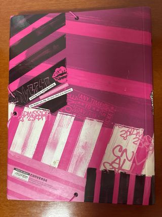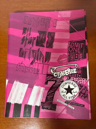 Carpeta con diseño llamativo de Converse All Star. - Estampado a rayas rosas y blancas. - Ilustraciones tipo graffiti y sellos. - Cierre con goma elástica. - Completamente nueva por dentro
