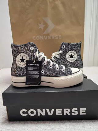 Zapatillas altas Converse Chuck Taylor All Star con un diseño brillante y llamativo. - Acabado con detalles de purpurina. - Cordones blancos. - Suela de plataforma. - Nuevas a estrenar con tiquet que lo demuestra. - Talla: 37