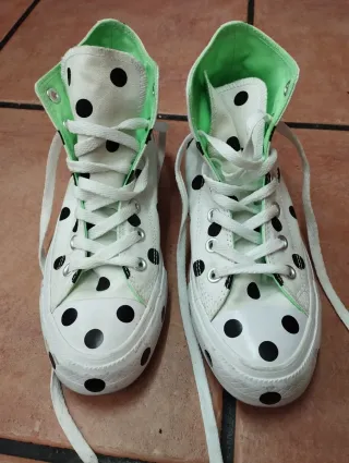 Zapatillas altas Converse Chuck Taylor con un divertido diseño de lunares negros sobre fondo blanco. El interior es de color verde brillante. - Diseño de lunares negros. - Interior de color verde. - Cordones blancos.