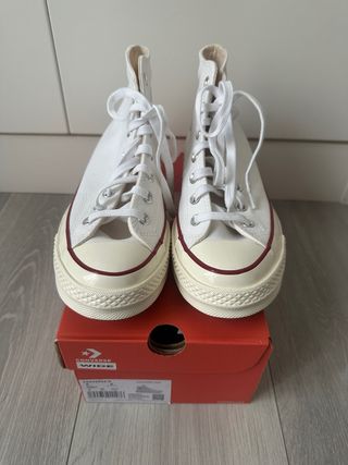 Vendo un par de Converse Chuck Taylor All Star, altas, de color blanco. Son usadas, pero están en muy buen estado,ya que solo las he puesto en un par de veces pero me quedan grandes y no estoy cómoda. - Son de lona. - Tienen cordones blancos. - La suela estáperfecta como se aprecia en las fotos.