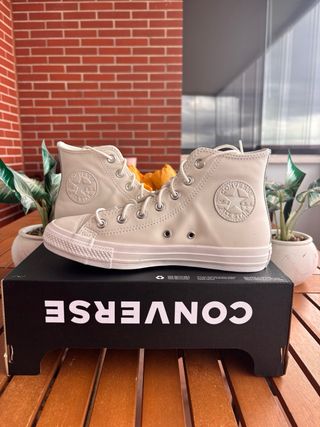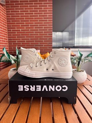 Zapatillas altas Converse Chuck Taylor All Star. - Color beige con detalles en negro. - Cordones blancos. - Suela gruesa de goma negra. Es un modelo muy cómodo por la soluela gordita que tiene Están como nuevas, solo tienen una puesta Las vendo por pequeñas