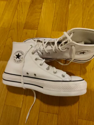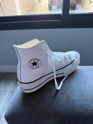 🏷️ Marca: Converse. 👌 Estado: Muy bueno. 🔎 Calidad: 8/10. 📏 Talla: 38. 💸 Precio en tienda: 90,00€. 📦 Envío: 24 horas. 🧼 Limpieza: Higienizadas y listas para estrenar. Descripción del calzado: • Modelo de bota alta en lona blanca clásica con el parche de la estrella en el tobillo. • Suela de Plataforma doble de goma apilada que añade altura y un toque moderno a cualquier outfit. • Incluye fotos de la etiqueta interior y la suela con el logo grabado para mayor seguridad. • Suela marrón con patrón de diamante en perfecto estado, con muy poco desgaste. • Plantilla de lona transpirable y ojales metálicos laterales para una ventilación ó