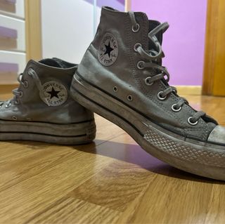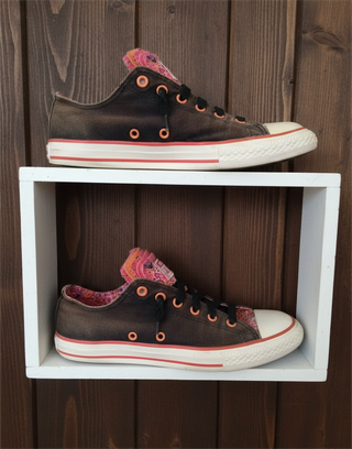 Zapatillas Converse de caña alta y baja, talla 38. Presentan un diseño único con estampado. Se ve genial, con altura de suela ajustable, solo está un poco desgastado. O sea, usado. El material es bueno, no es el típico de Converse sino un modelo exclusivo. Por desgracia, está agrietado justo en el sitio donde siempre se doblan primero los Converse. Se ve en la foto. Para quien no sea muy tiquismiquis, está perfectamente bien.