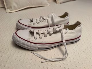 Zapatillas Converse de color blanco, modelo clásico sin plataforma. Perfectas para el día a día. - Cordones blancos. - Suela de goma. - Doble línea de color en la suela. Tengo Talla 41.5, 40
