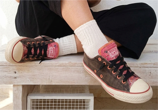 Converse Chuck Taylor All Star de diseño único con doble lengüeta. Destaca por su contraste entre el exterior en lona oscura con efecto desgastado y un interior vibrante con estampados de corazones y motivos tipo paisley en tonos rosas, naranjas y púrpuras. Modelo: Double Tongue con forro decorativo. Talla: 37.5 EU. Color: Exterior carbón/marrón desgastado con detalles en coral/rosa. Bastante uso, lo que les da un look "distressed" muy buscado, pero están muy bien conservadas. La estructura está sólida, los ojales en color coral contrastan perfectamente y los cordones negros están en buen estado. Suela presenta el desgaste lógico