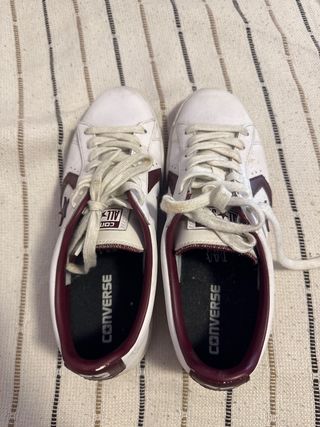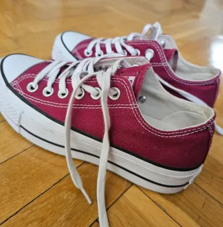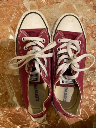 Zapatillas bajas de la marca Converse en color granate. Un clásico para el día a día. - Diseño de caña baja. - Cierre con cordones blancos (intercambiables) - Detalle de estrella blanca en el lateral. Las compré por capricho pero no es mi número, apenas usadas. Desgaste trasero por ir en coche.
