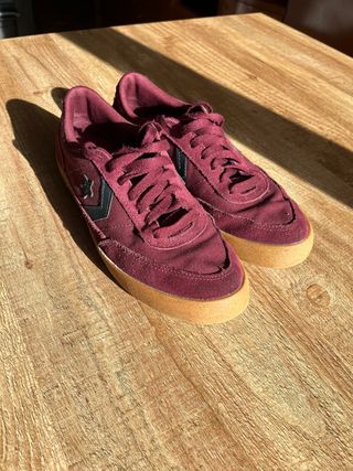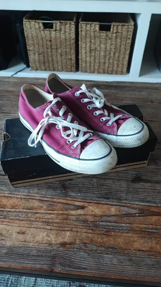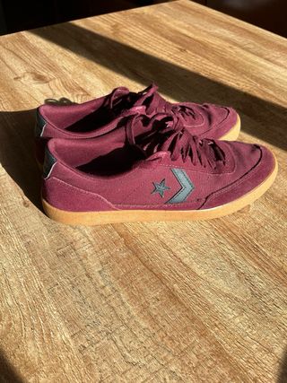 Converse bajas de color granate/burdeos de talla 42. Tienen buen uso pero han estado bien cuidadas, conservando su caja original y sin presentar desperfectos mayores.