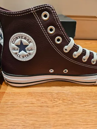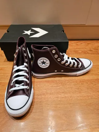 Zapatillas altas de la marca Converse en talla 41. Un diseño clásico con un toque moderno. Color burdeos muy oscuro ( casi marrón - Material exterior de simil cuero. - Detalle del logo circular de Converse All Star. - Cordones blancos. - Suela de goma blanca con detalles negros.