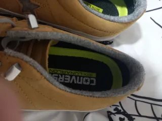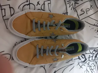 Zapatillas Converse de color amarillo y gris, talla 36. Poco uso,como podéis ver están poco desgastadas en la suela.Tengo los cordones originales pero me parece más fácil de ponerlas así El material es como piel y algo caliado in interior en la parte gris..Mas artículos similares en mi perfil - Diseño con estrellas. - Cordones grises. - Suela blanca.