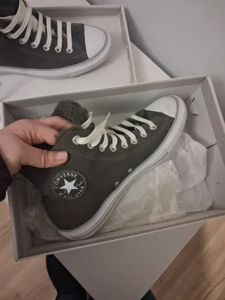 Zapatillas Converse All Star de ante en color gris, forradas con pelo para mayor calidez, muy calentitas. - Diseño de caña alta. - Cierre con cordones blancos. - Detalle de estrella en el lateral.Están nuevas,una Puesta en la calle para probarlas únicamente,pero no me sirven,ver sin compromiso.