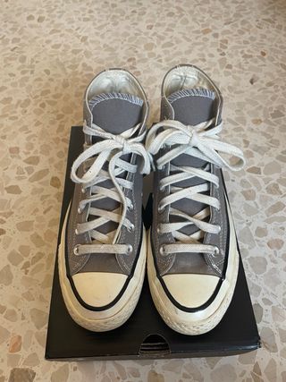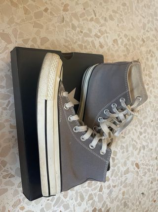 Converse Chuck Taylor altas de color gris, talla 36. Son unas zapatillas en estupendas condiciones, ideales para el día a día. - Modelo clásico y atemporal. - Suela de goma en perfecto estado. - Listas para usar. - Como nuevas, usadas unicamente un par de veces.