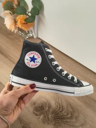 Playeros clásicos Converse ALL STAR de caña alta, en color negro, con el estilo atemporal que nunca pasa de moda. Son unos tenis con uso, pero todavía funcionales y perfectos para quien busque un par original a buen precio ✨ Detalles del producto: 👟 Marca: Converse ⭐ Modelo: ALL STAR (visible en la suela) 📏 Talla: 40 🎨 Color: Negro con puntera y suela blanca 🧼 Estado general: Usados, necesitan una buena limpieza para quedar como nuevos 🔍 Desgaste: Logos interiores y posteriores con evidentes signos de desgaste Suelas un poco desgastadas por el uso ✅ Uso: Aún se pueden utilizar sin problema