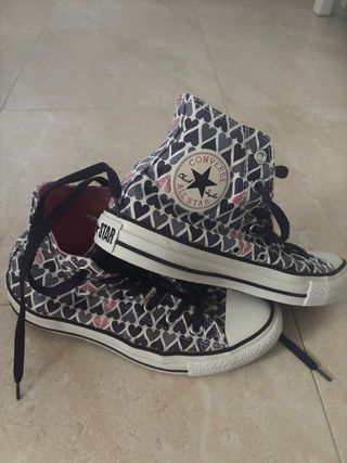Zapatillas altas Converse All Star con un divertido estampado de corazones. - Diseño de corazones en gris y rosa. - Cierre con cordones. - Logo de All Star en el lateral. -Adquiridas en EEUU