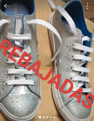 Zapatillas Converse plateadas con un toque de brillo, perfectas para las pequeñas. - Diseño brillante con detalles de confeti. - Cierre con cordones blancos. - Interior azul.