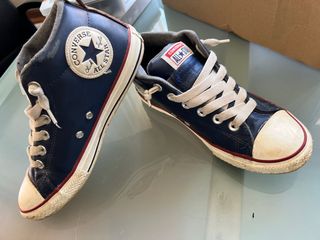 Zapatillas deportivas Chuck Taylor All Star Mid Junior. Caña Media para niños/chicos. Color Azul marino de Piel. Están acolchadas para él invierno. Cordones fijos para ponérselas y quitárselas fácilmente. La piel tiene un par de rozaduras.