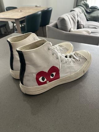 Bambas: Converse Comme des Garçons (CDG) 👟❤️ • Precio Original: 149,99€ 💰 • Color: Beige, Beis, Off-white, Off white • Talla: 44 Europa 📏 Entrega Instantánea en Barcelona 🚚💨 • 1 a 2 horas MÁXIMO⏱ Precio Final Negociable 💵 • Acepto efectivo o tarjeta 🪙 💳