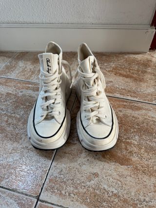 Zapatillas Converse altas de color blanco de cuero con plataforma. Un clásico reinventado para un estilo urbano. - Diseño de caña alta. - Cierre con cordones. - Detalle de logo en el lateral. -La converse izquierda tiene la plantilla un poco levantada pero con cambiársela va genial -Las compré a 130
