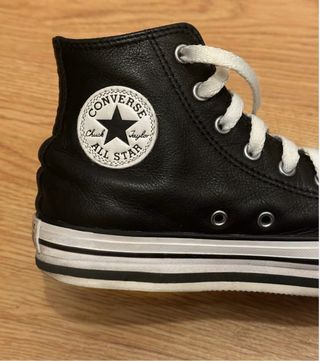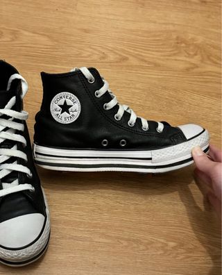 Botas altas Converse de plataforma negras de piel. Originales de la talla 34 en bastante buen estado. El único desperfecto es que tiene Algún agujero como se puede ver en la foto por lo demás están en perfecto estado