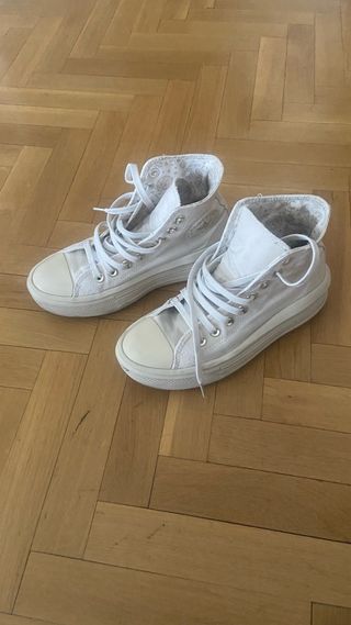Vendo Coverse Chuck Taylor. Suela con plataforma. Talla 35 EU. Color blanco. Tienen dos puestas. Estan como nuevas, algo sucias porque son blancas, pero con muy poco uso.