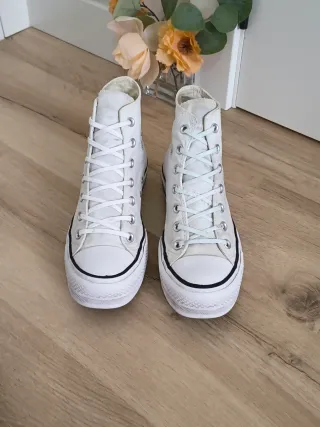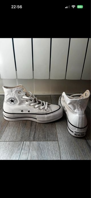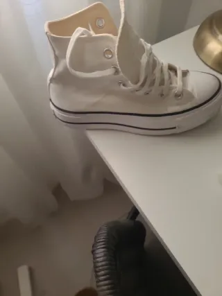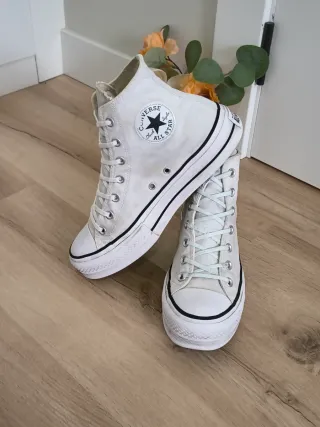 Zapatillas Converse de caña alta con plataforma. - Diseño clásico en color blanco. - Cordones blancos. - Suela de plataforma. - Tengo 39 y 39,5