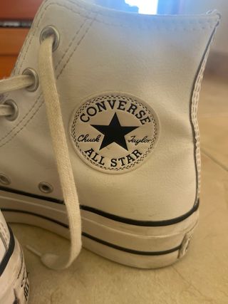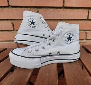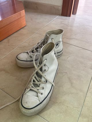 Zapatillas Converse Chuck Taylor All Star blancas de plataforma leve. Son de caña alta y están en buen estado. Hay que limpiarlas (no he tenido tiempo) pero no tieneb ni un rasguño. Son un 37, las vendo porque me apretan. - Modelo: Chuck Taylor All Star - Plataforma - Caña alta - Ideales para un look casual