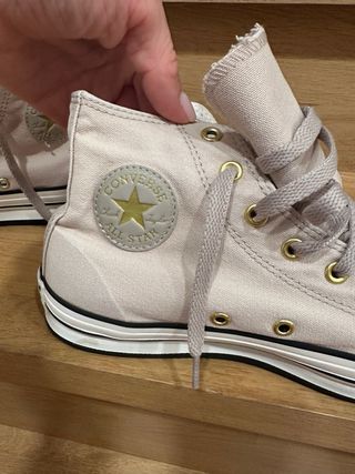 Zapatillas altas Converse en color gris muy clarito. Pone que es talla 37 de Converse, pero yo diría que es más bien una 38. - Diseño clásico de caña alta. - Suela de plataforma. - Cordones blancos. Usada en un par de ocasiones, suela prácticamente nueva.