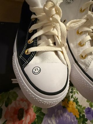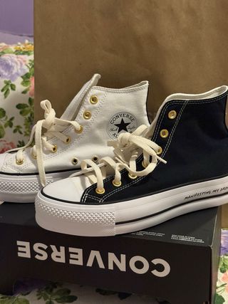 Converse Chuck Taylor All Star plataforma, talla 39. Ideales para darle un toque moderno a tu estilo. Unisex Originales - Diseño bicolor en blanco y negro. - Detalles dorados en los ojales. - Estampado de una carita feliz en la puntera.