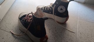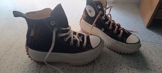 Converse Chuck Taylor All Star Lift Platform de plataforma, talla 37. Son negras y tienen un diseño de sol bordado. Están en buen estado, prácticamente nuevas - Suela de plataforma gruesa. - Cordones color rosa claro. - Detalle bordado de sol y luna.