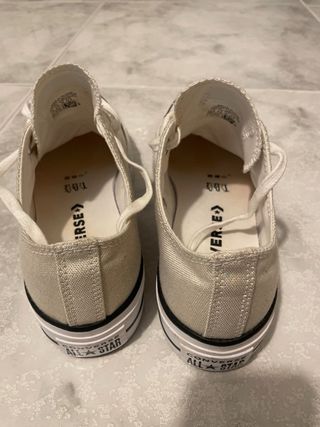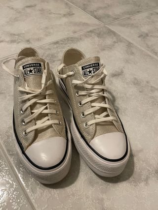 Zapatillas de plataforma Converse en color beige y dorado. Un clásico reinventado para un estilo único. - Diseño de caña baja. - Cierre con cordones. - Suela de goma gruesa. Puestas una vez.