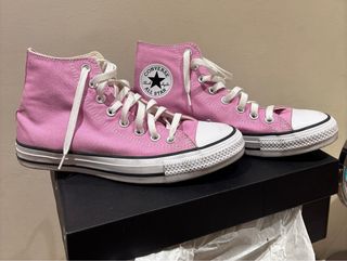 Zapatillas Converse All Star de caña alta en color rosa. - Cordones blancos. - Suela blanca con detalles negros. - Parte superior de tela. Están algo gastadas por fuera como se aprecia en la foto. Pero las zapatillas están bien.