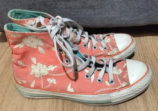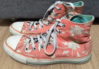 Zapatillas altas Converse con un bonito estampado floral. - Diseño floral sobre fondo rosa. - Interior en color verde menta. - Cordones blancos. Tienen varios desperfectos, véanse en las fotografías.
